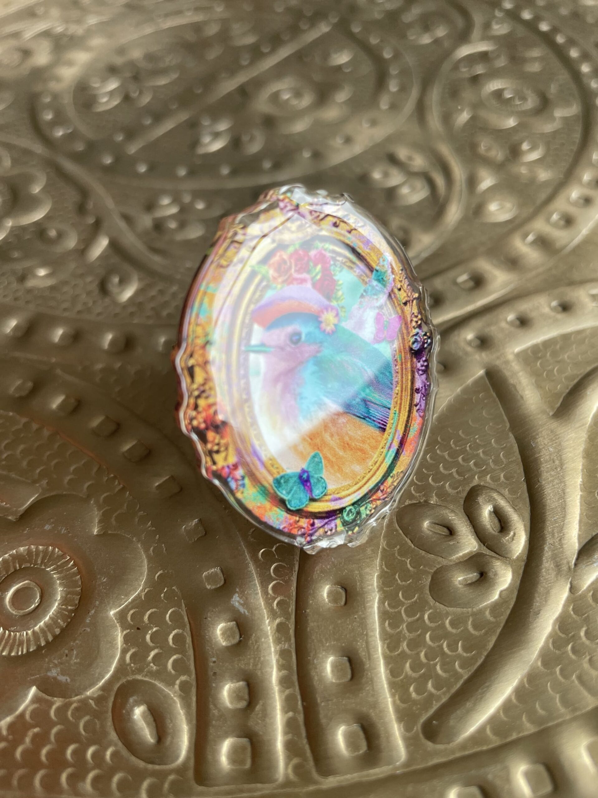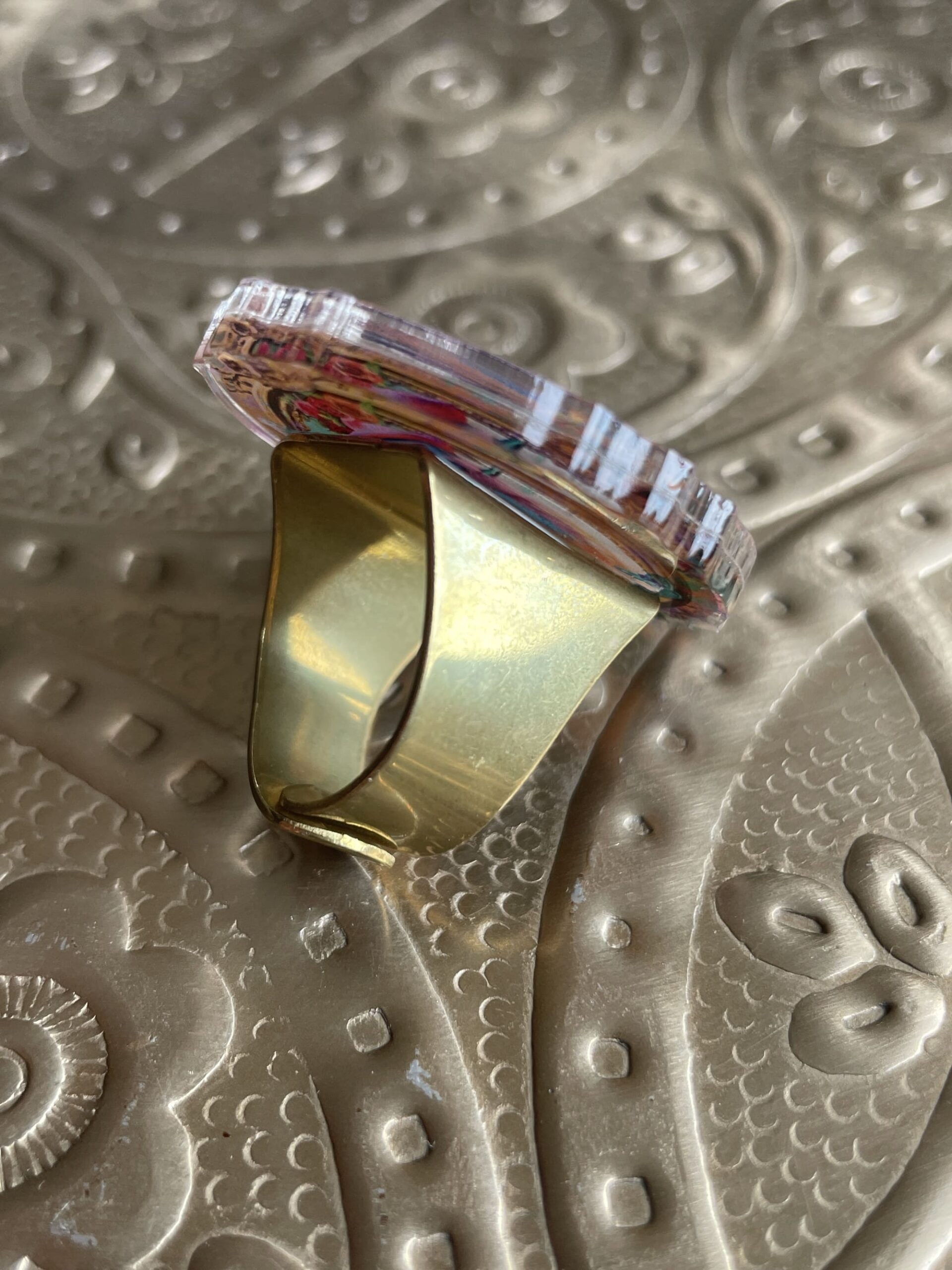 L’ensemble est monté sur un support de bague ajustable (2 tailles) en laiton de qualité fabriqué en France. Ne convient pas aux doigts très fins.