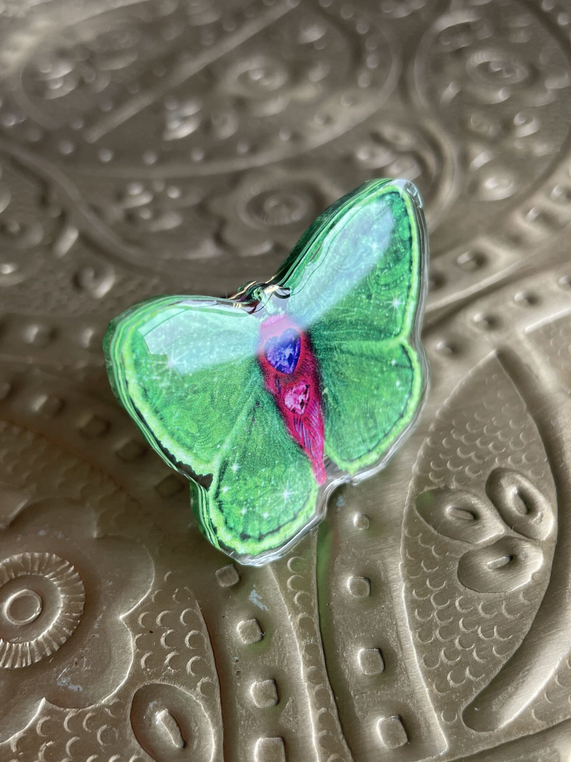 En acrylique recyclé, parce que c’est tellement mieux pour la planète. Avec un dôme en résine sublimant le visuel imprimé en recto verso.