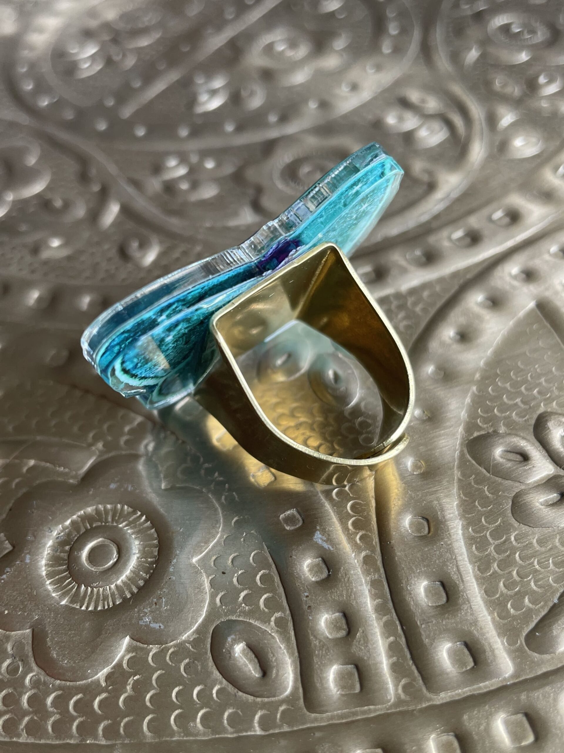 L’ensemble est monté sur un support de bague ajustable (2 tailles) en laiton de qualité fabriqué en France. Ne convient pas aux doigts très fins.