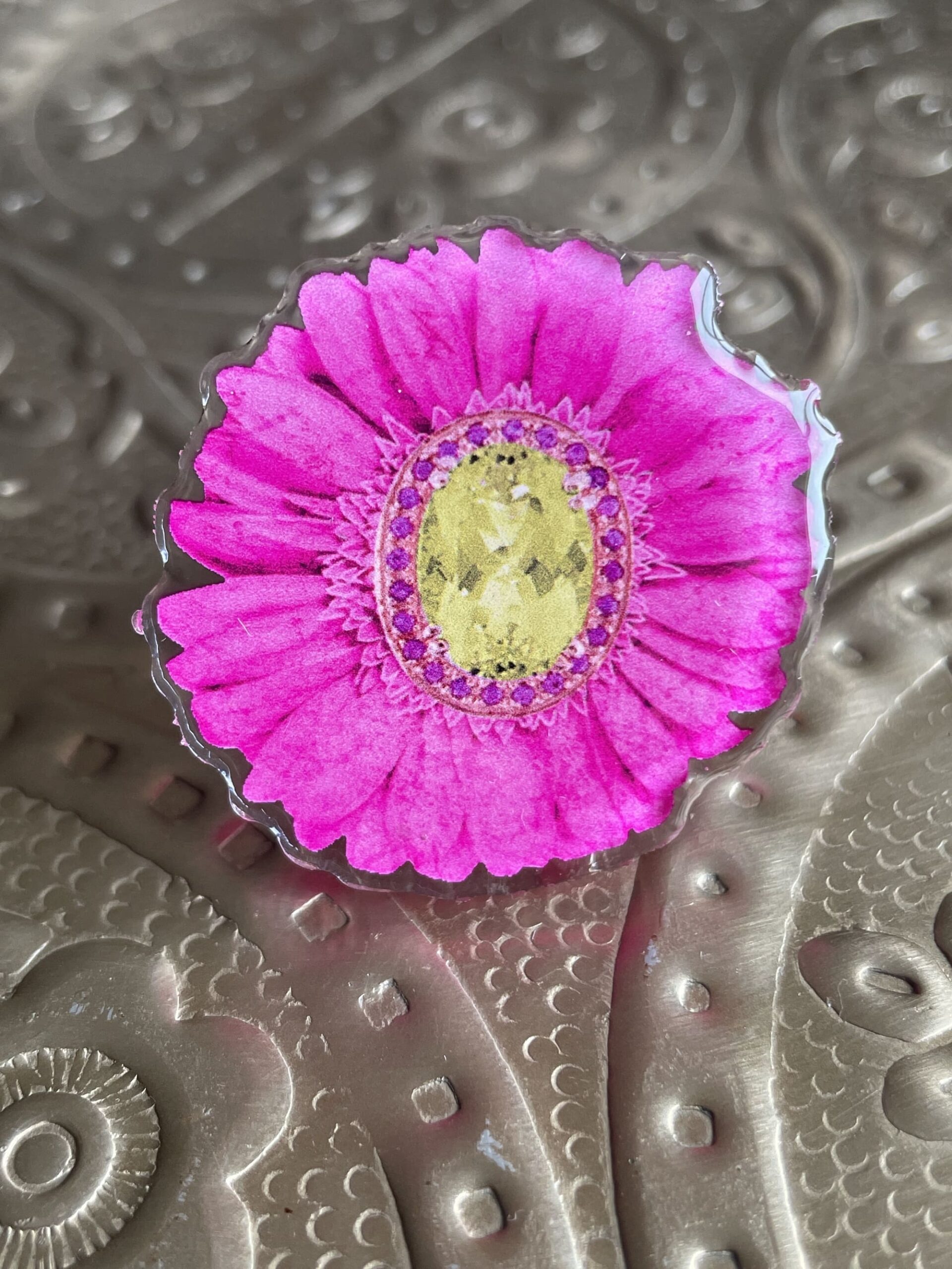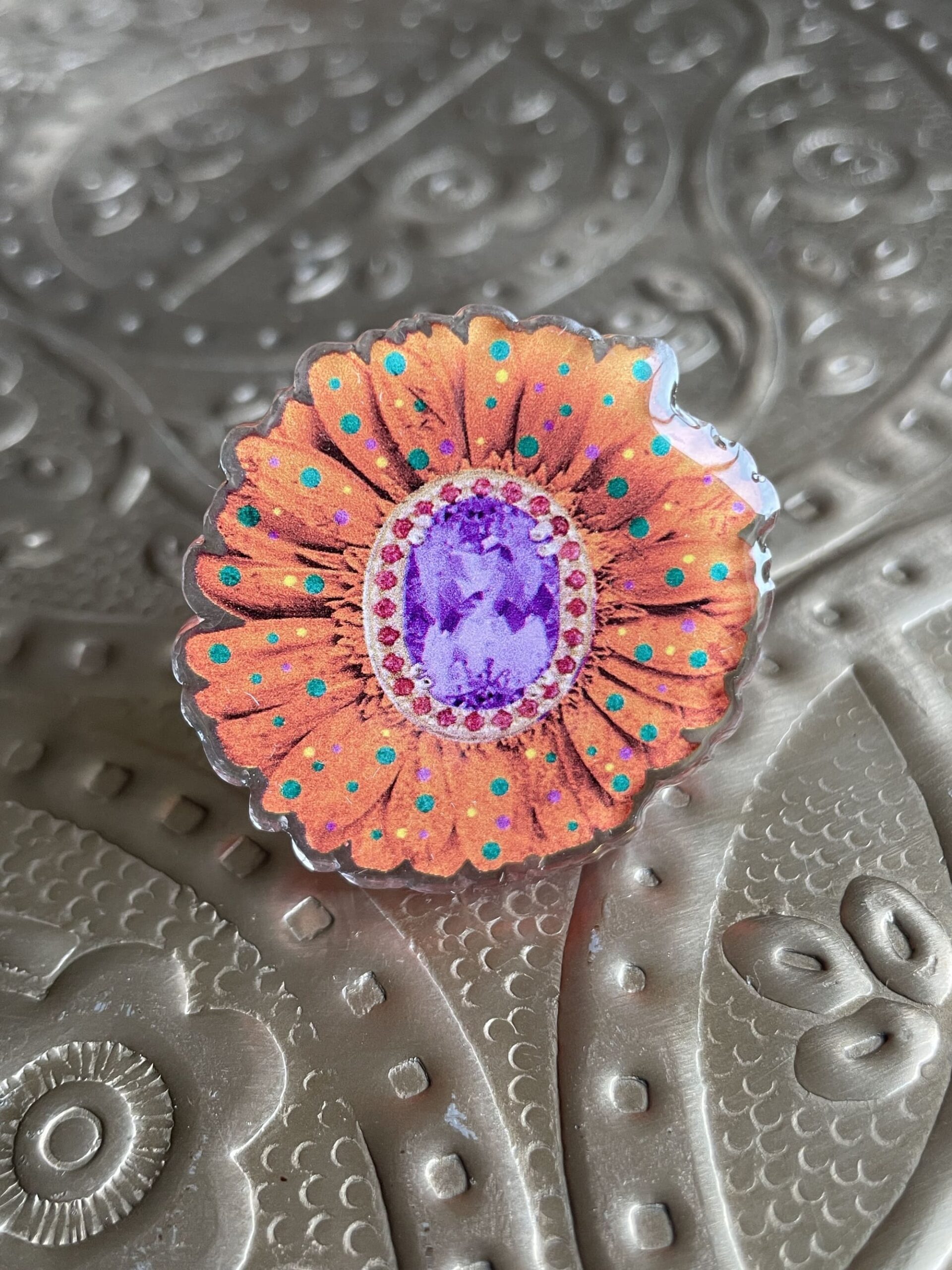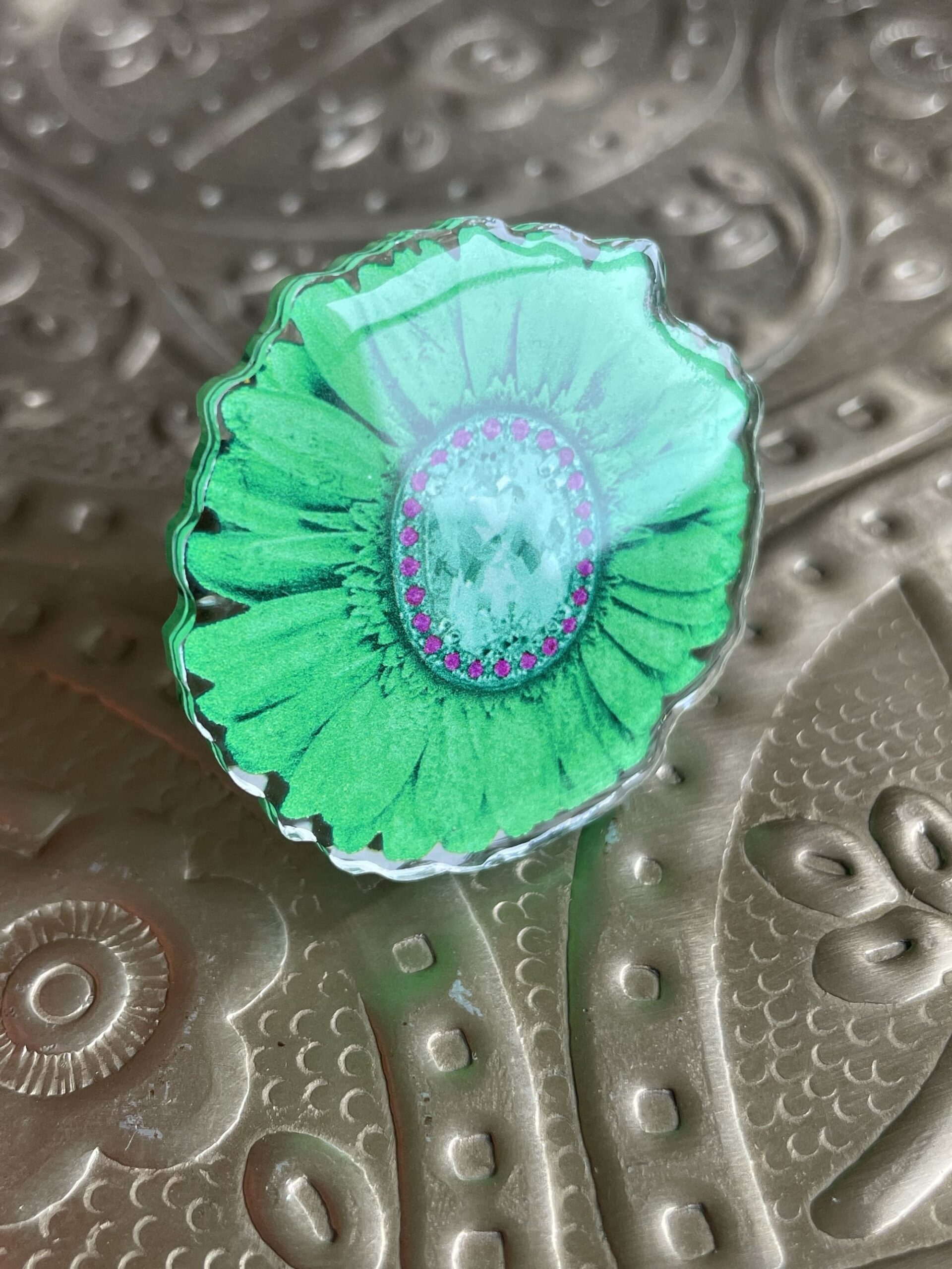 En acrylique recyclé, parce que c’est tellement mieux pour la planète. Avec un dôme en résine sublimant le visuel imprimé en recto verso.