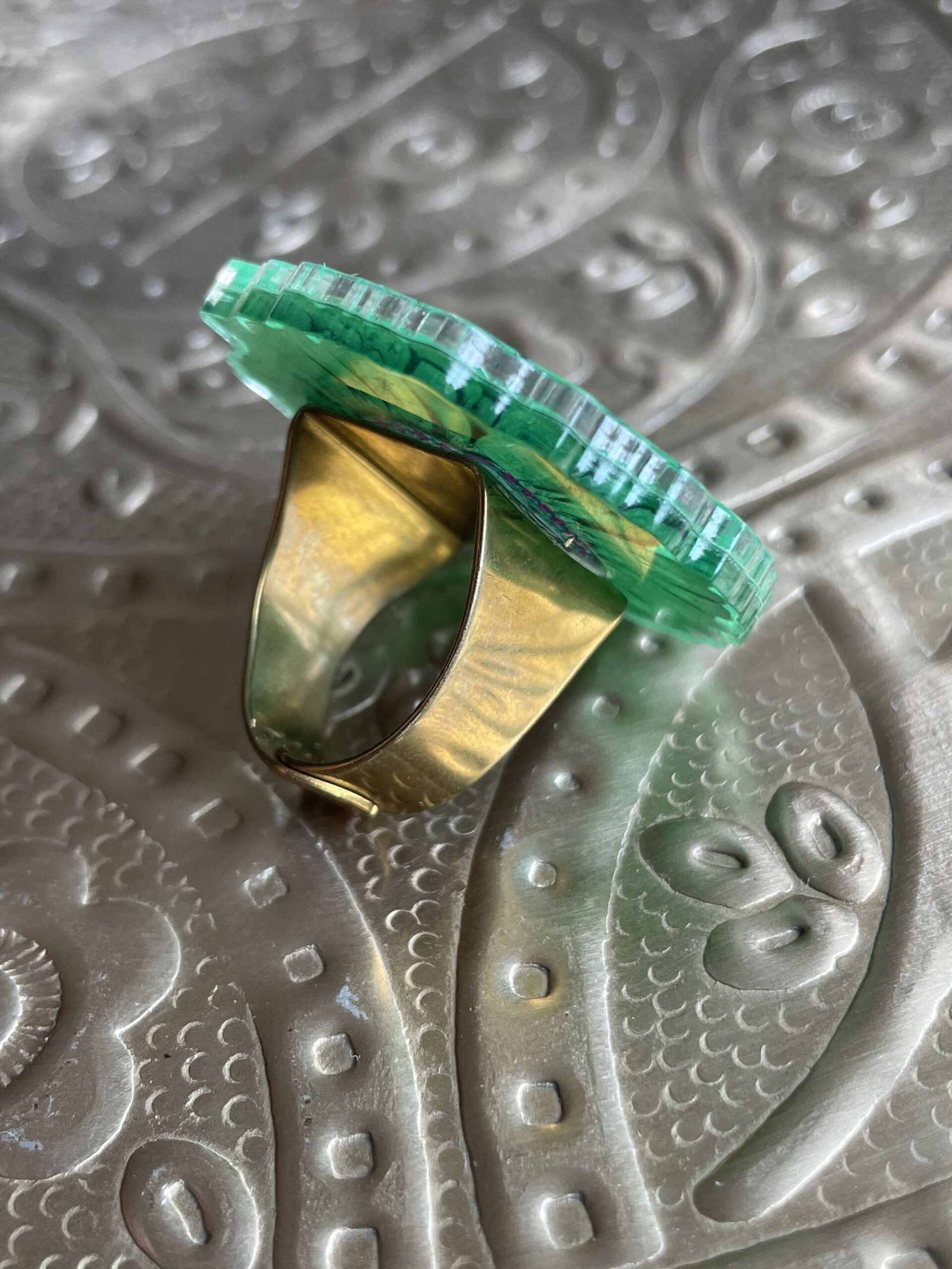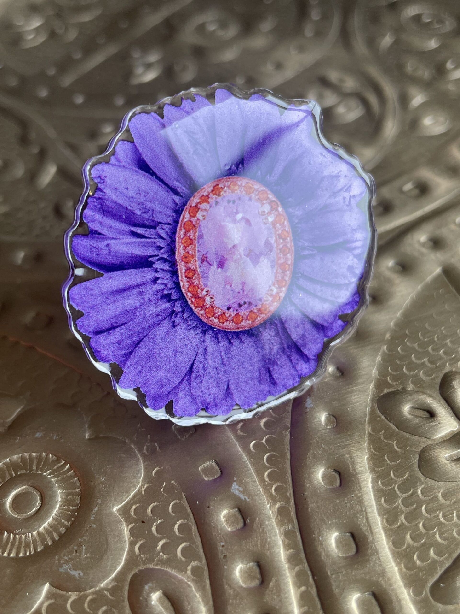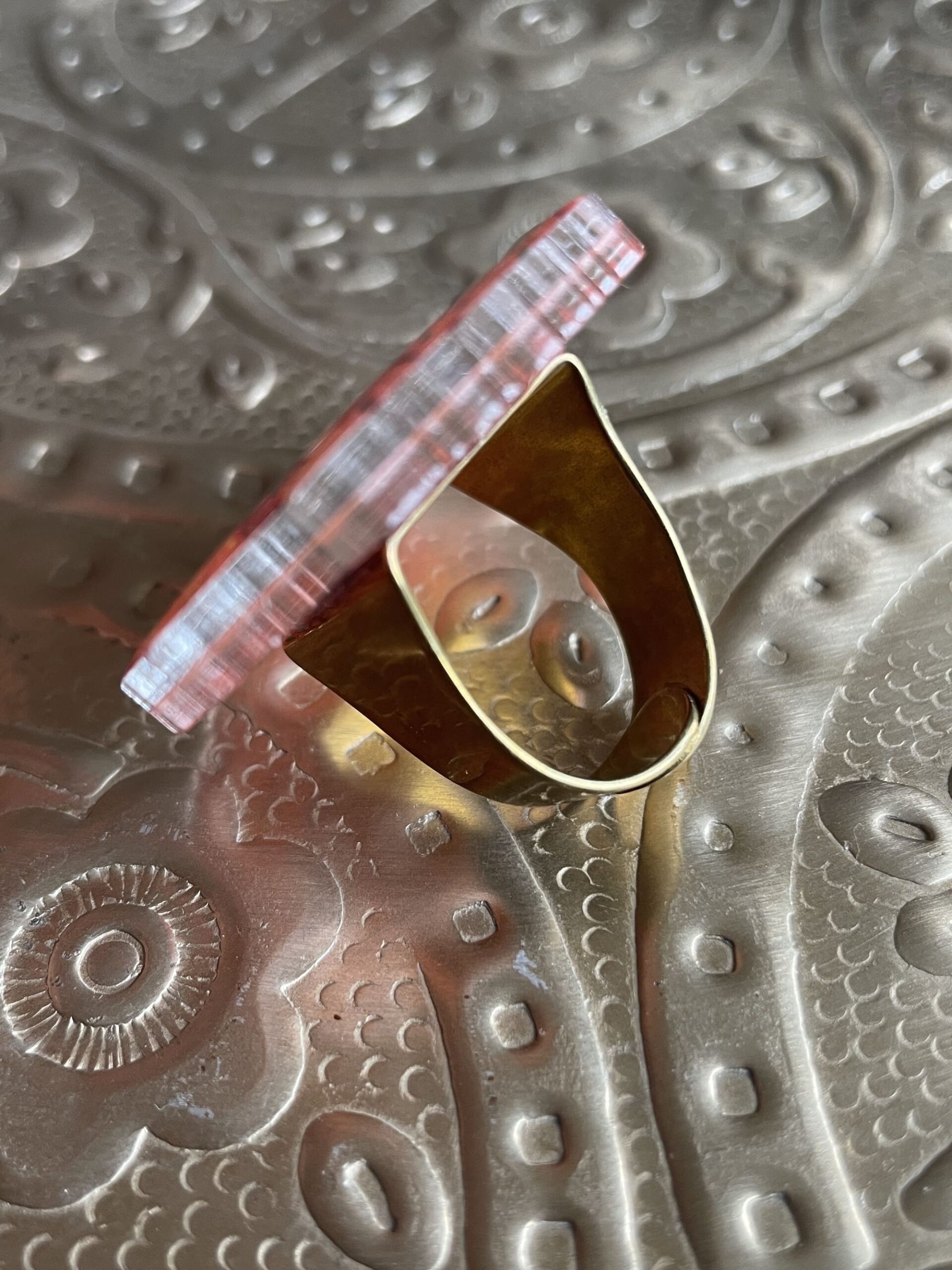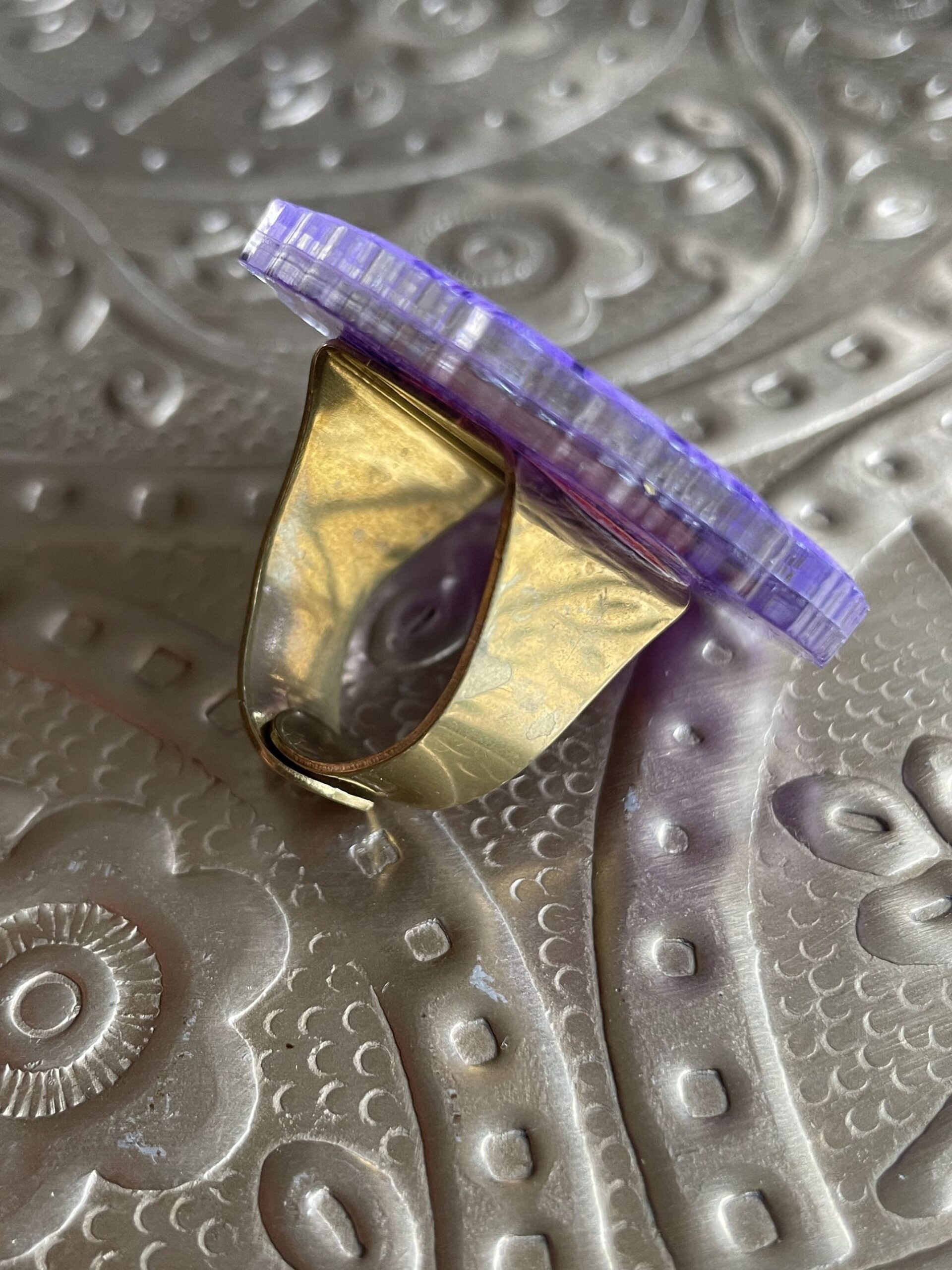 L’ensemble est monté sur un support de bague ajustable (2 tailles) en laiton de qualité fabriqué en France. Ne convient pas aux doigts très fins.