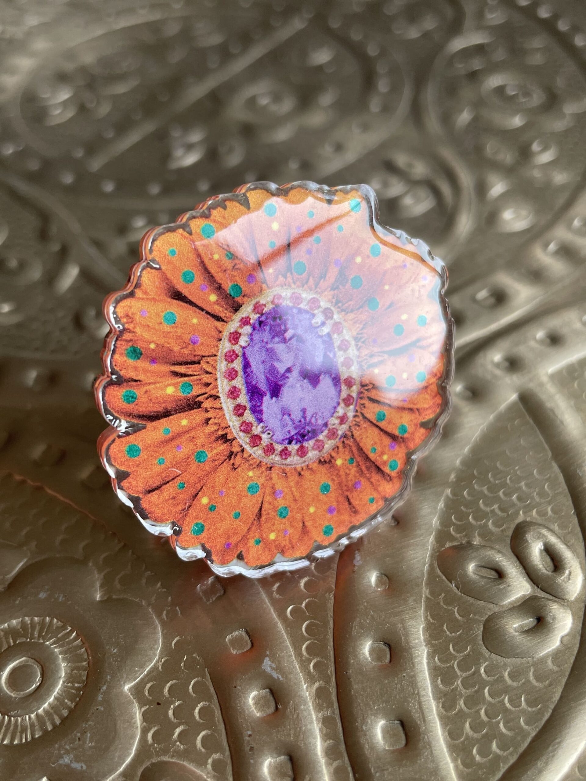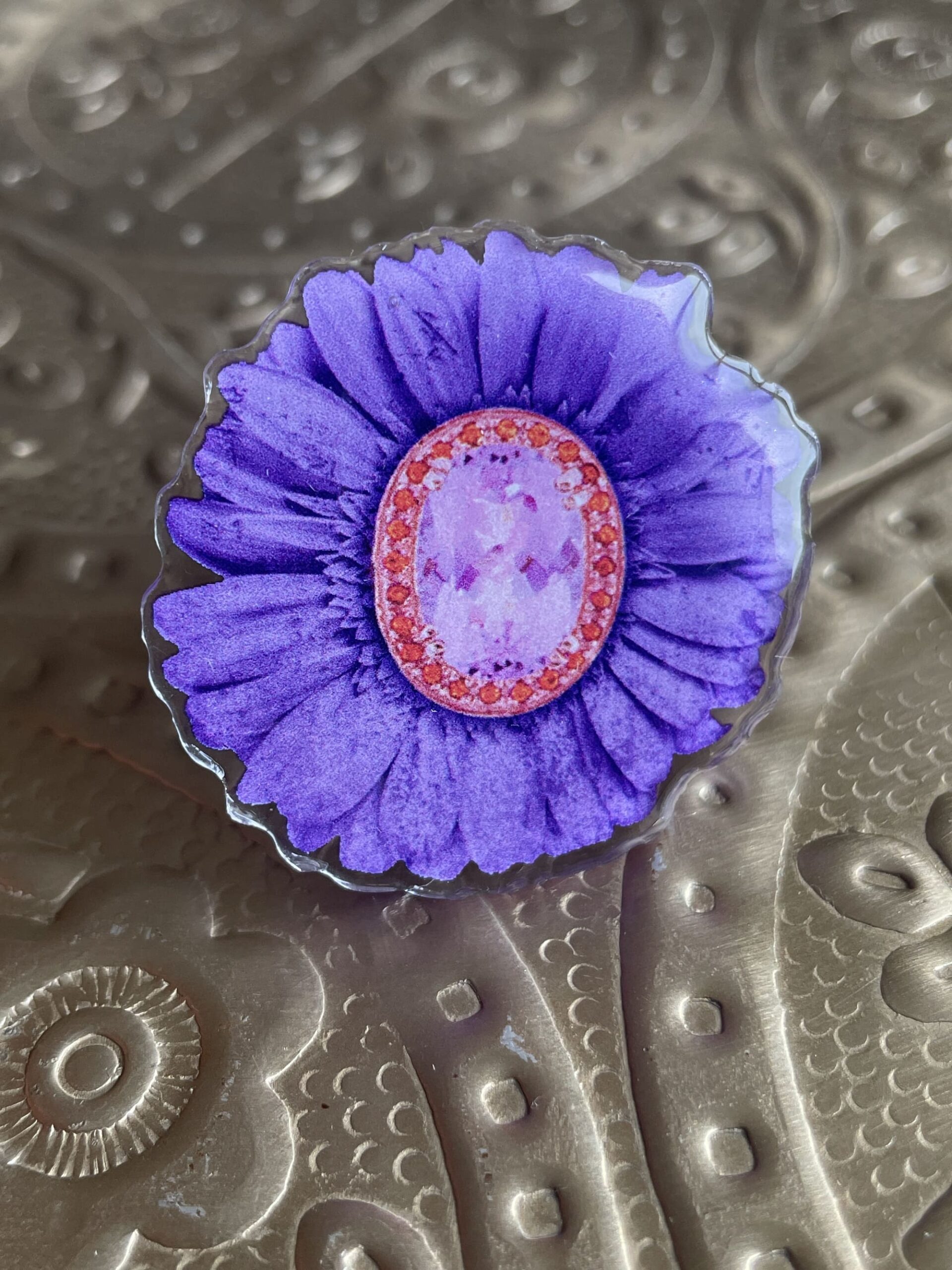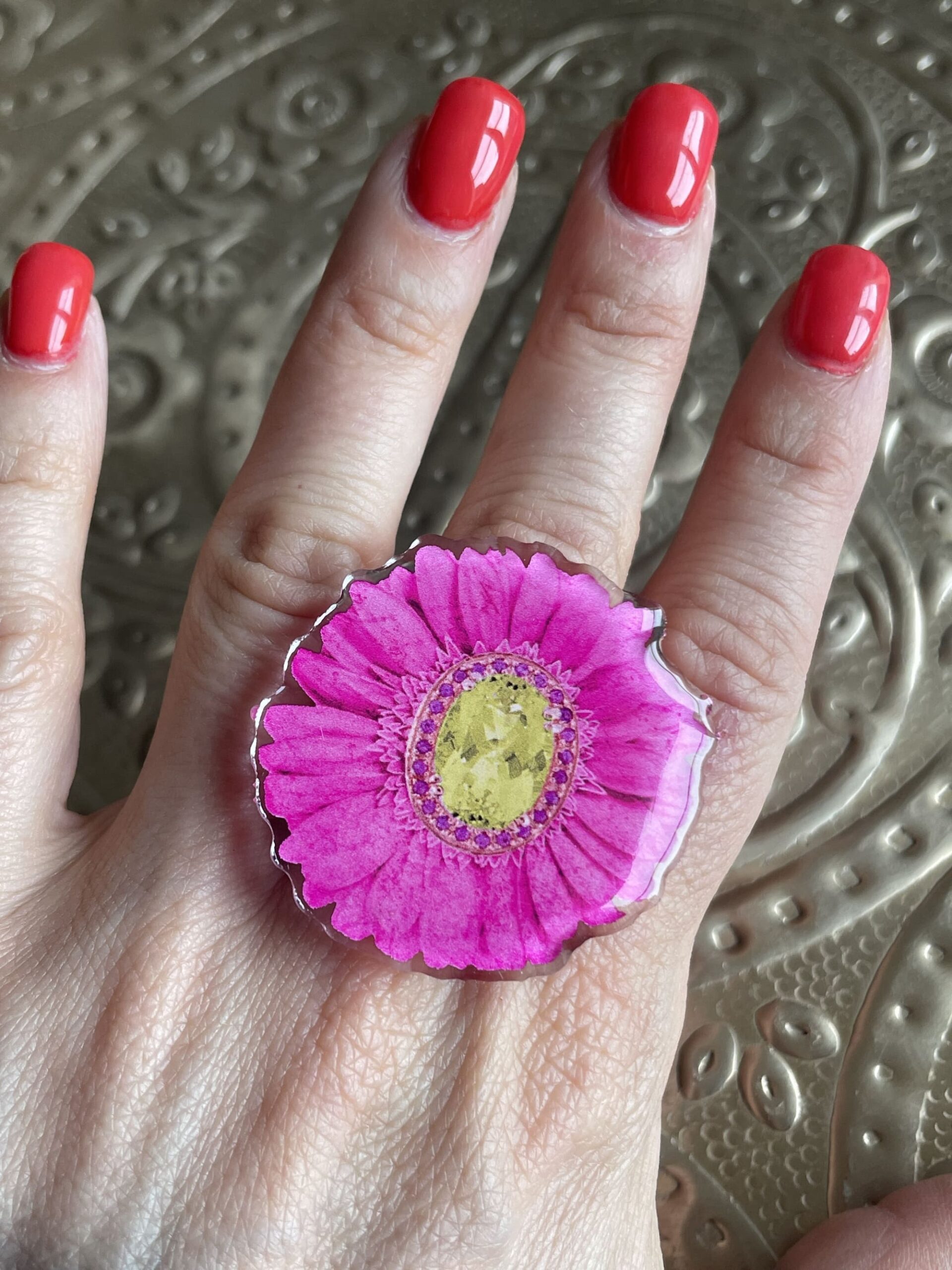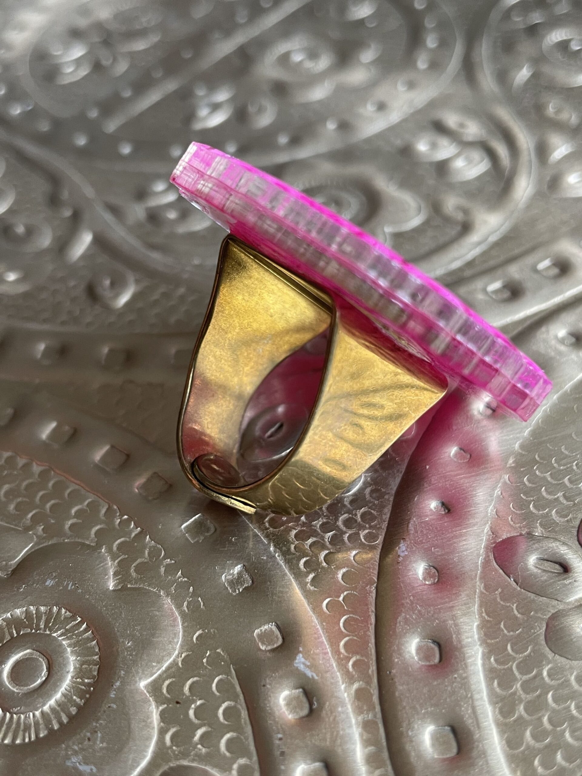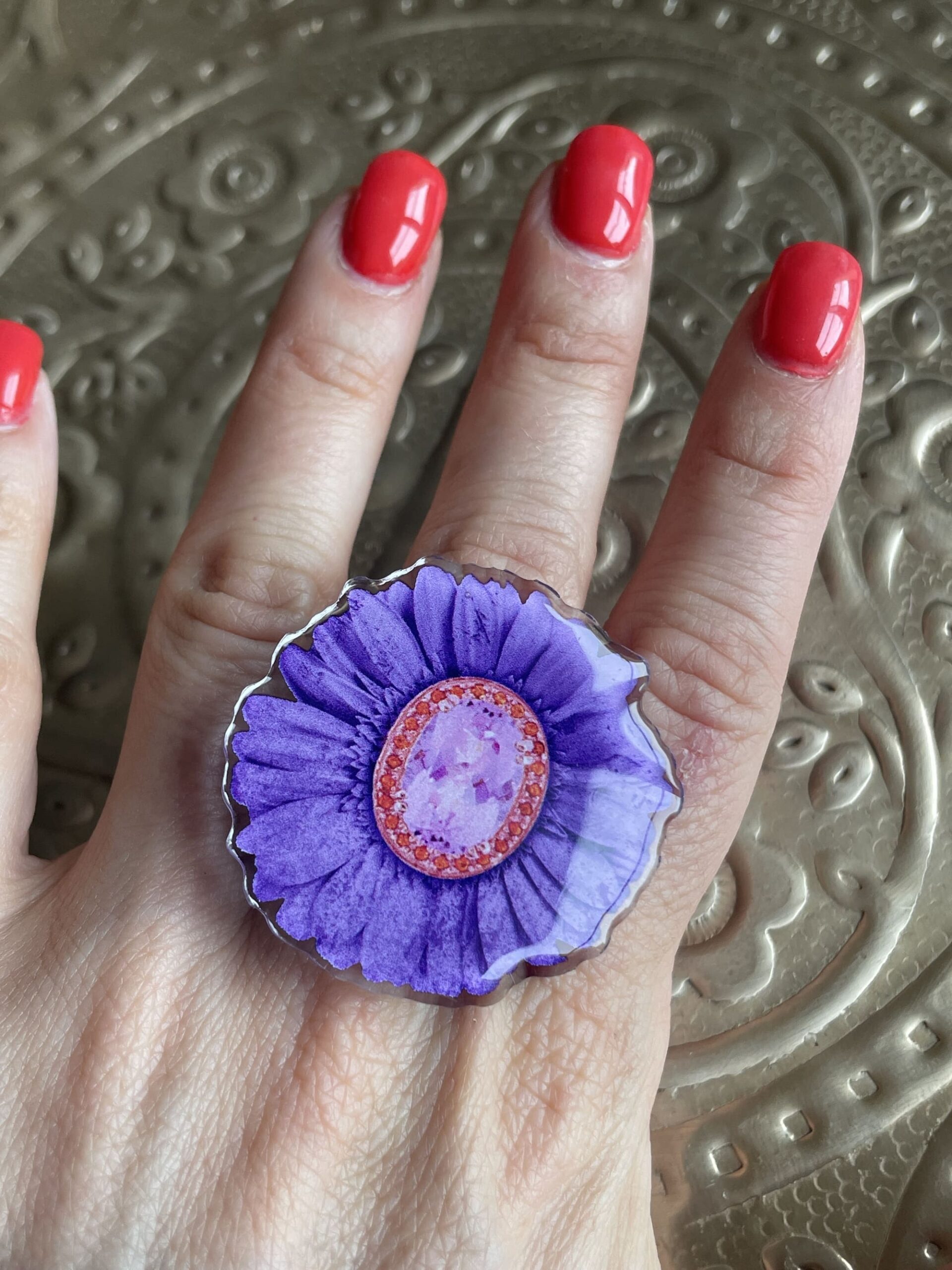 L’ensemble est monté sur un support de bague ajustable (2 tailles) en laiton de qualité fabriqué en France. Ne convient pas aux doigts très fins.