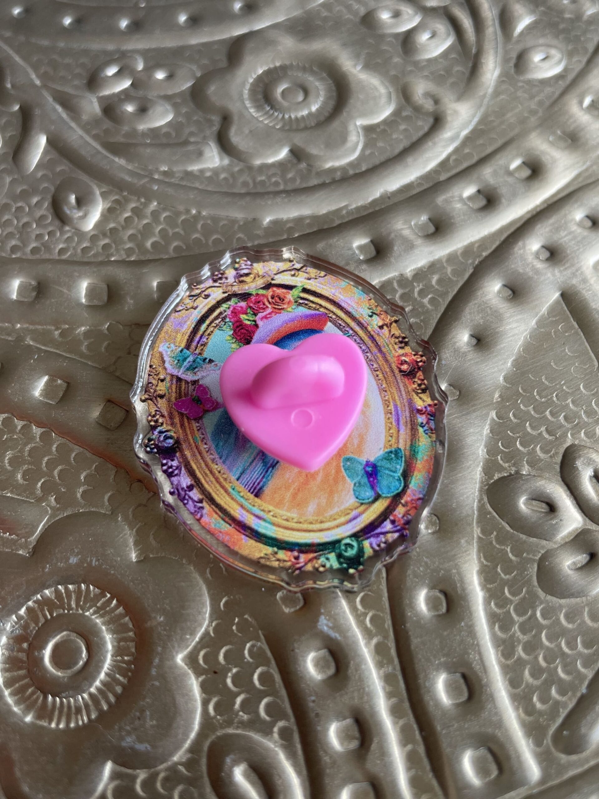 En acrylique recyclé transparent parce que c’est mieux pour la planète. Avec son attache au dos en forme de coeur rose.