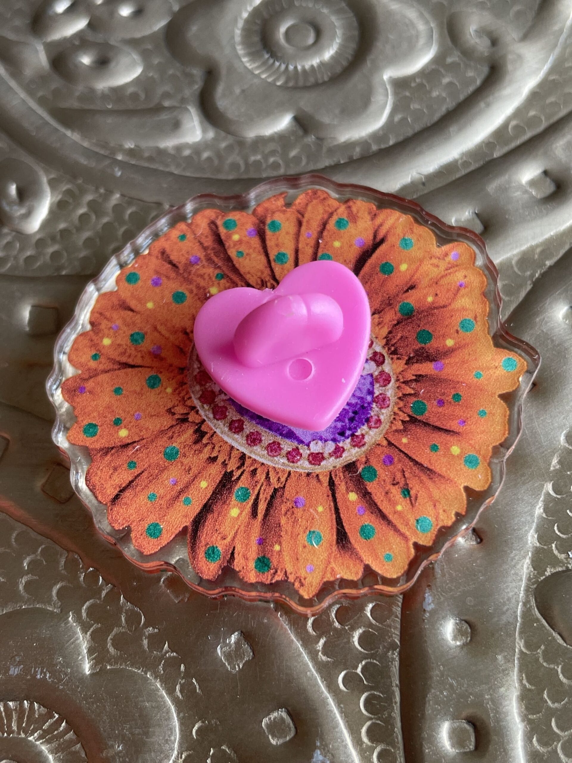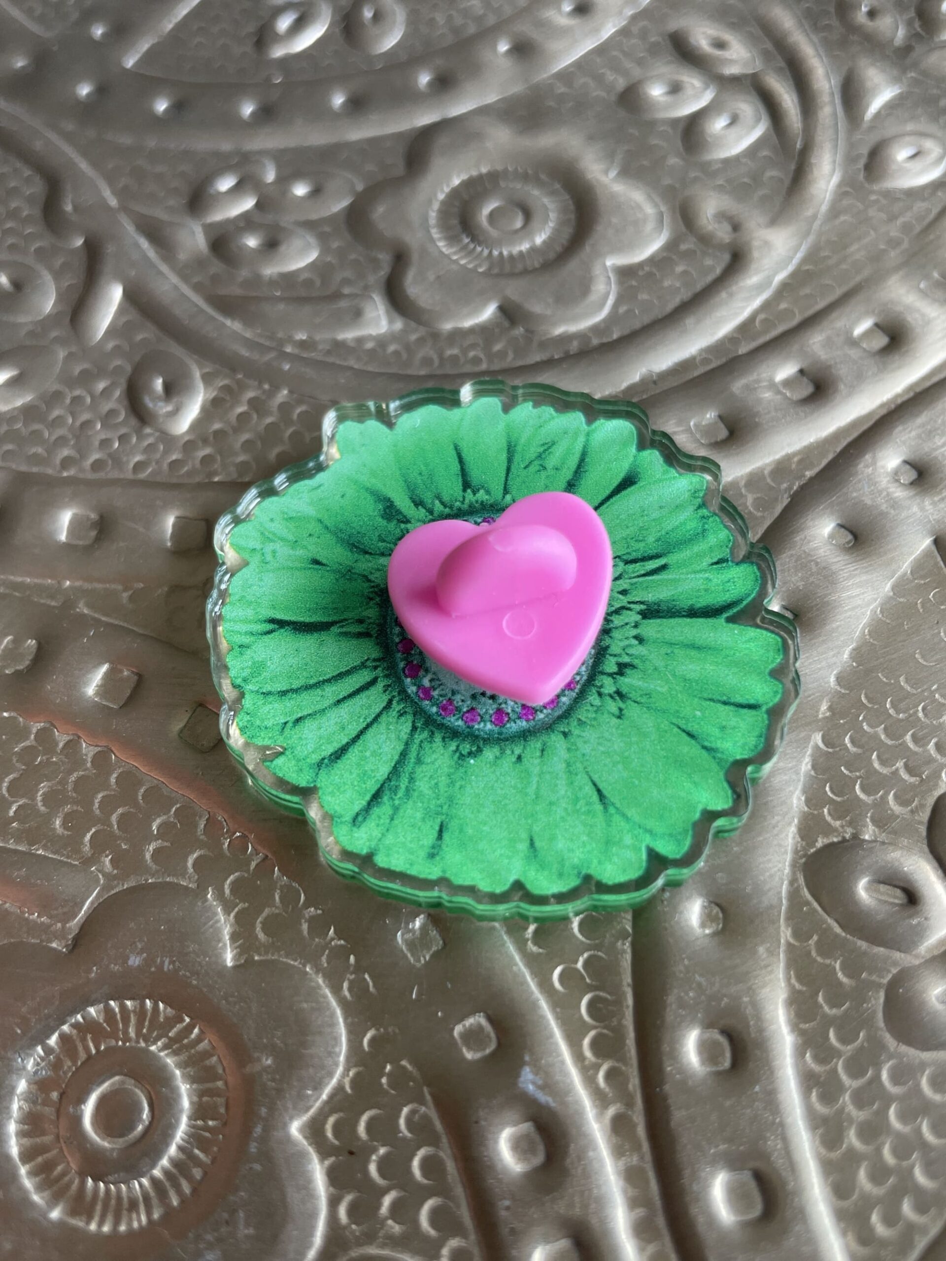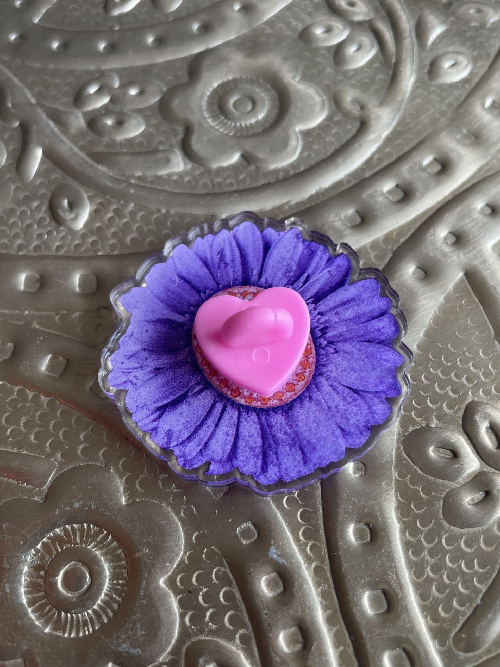 En acrylique recyclé transparent parce que c’est mieux pour la planète. Avec son attache au dos en forme de coeur rose.